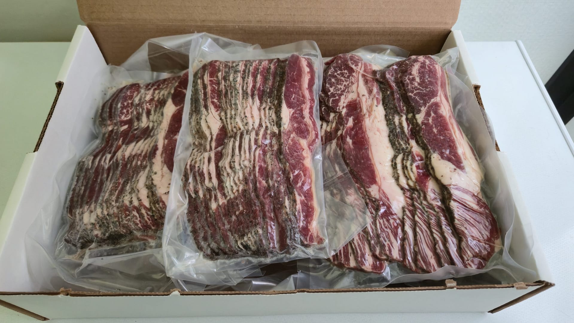 Très bon bacon de boeuf. Profil de goût différent du bacon de porc. Beaucoup moins gras. À essayer pour ceux qui n’ont jamais goûté au bacon de boeuf