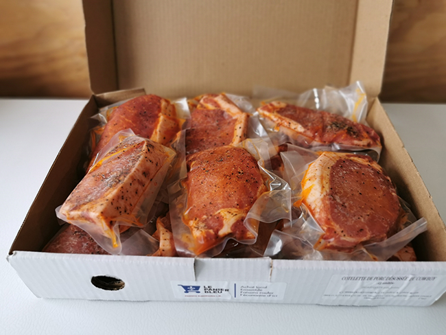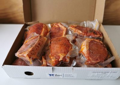 | Cuisson | "Bbq ou poêle: 8 min./côté Four: 350°F, 25 min" |