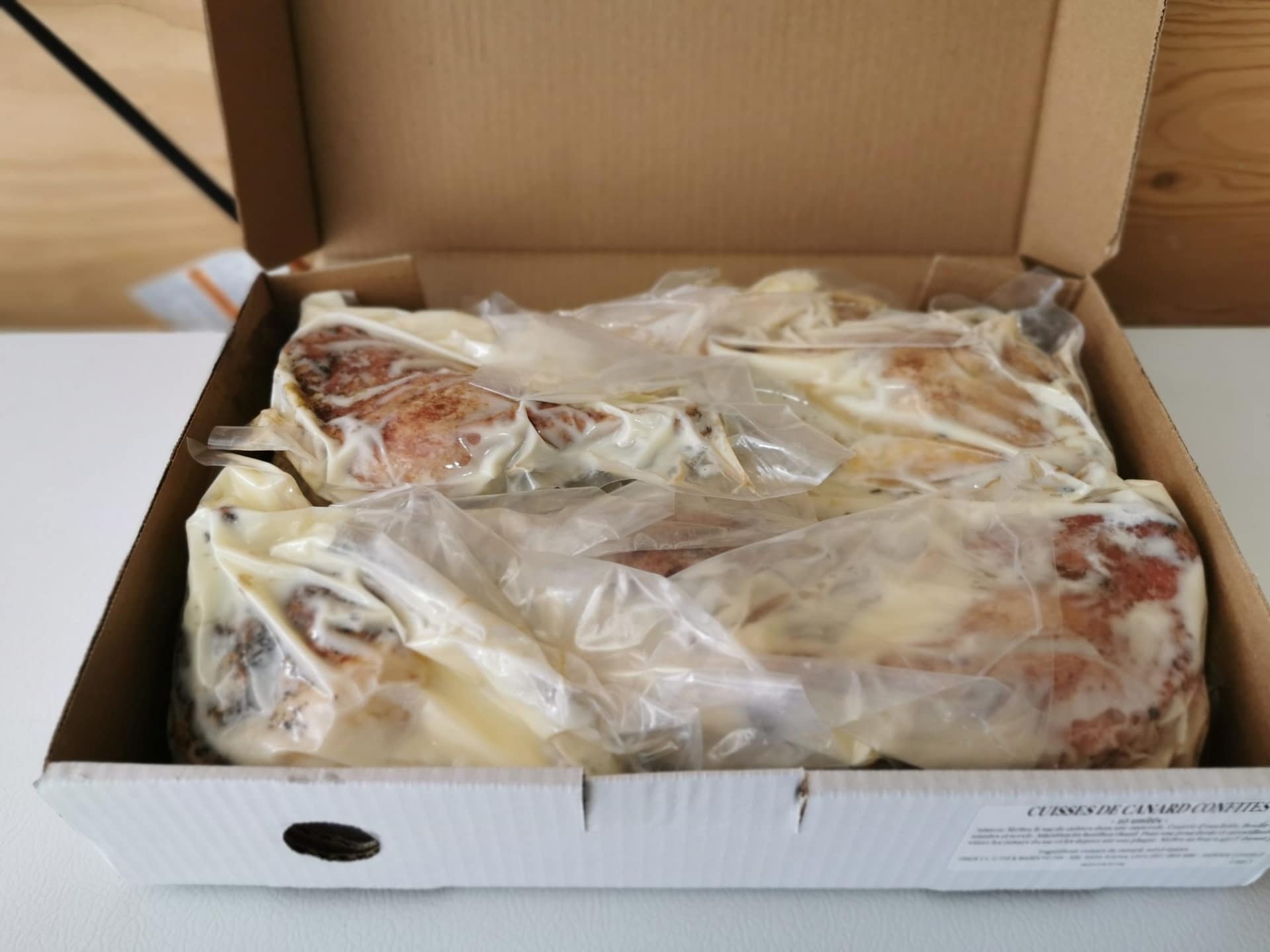 | Cuisson | Une fois décongelé, mettre dans l'eau avec son sous-vide et porter à ébullition, laisser 10 min à feu doux, mettre au four à 450°F pendant 5 min pour une peau plus croustillante. |