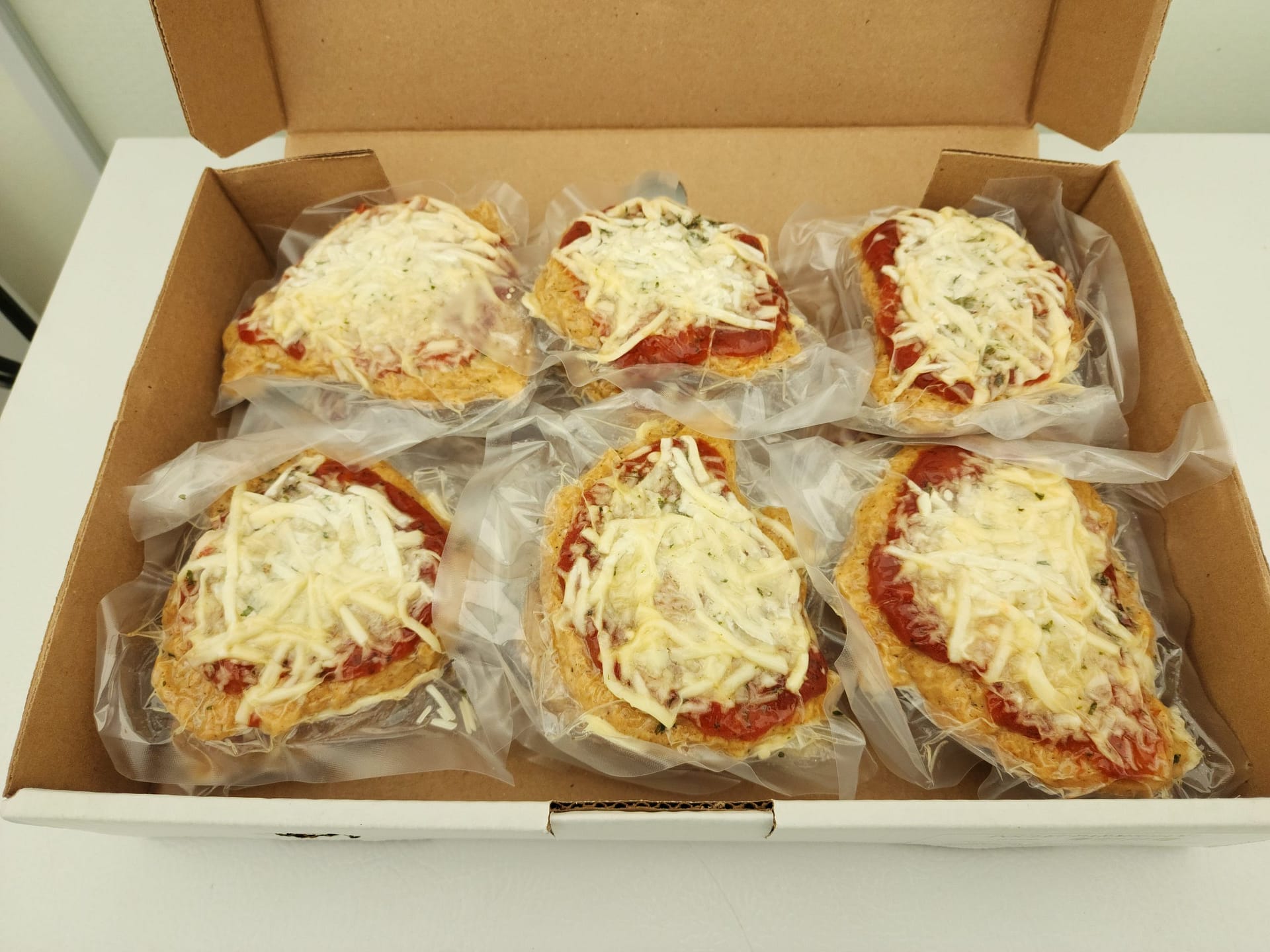 | Ingrédients? | Poulet, sauce tomate, épice, fromage mozzarela, fromage parmesan. |