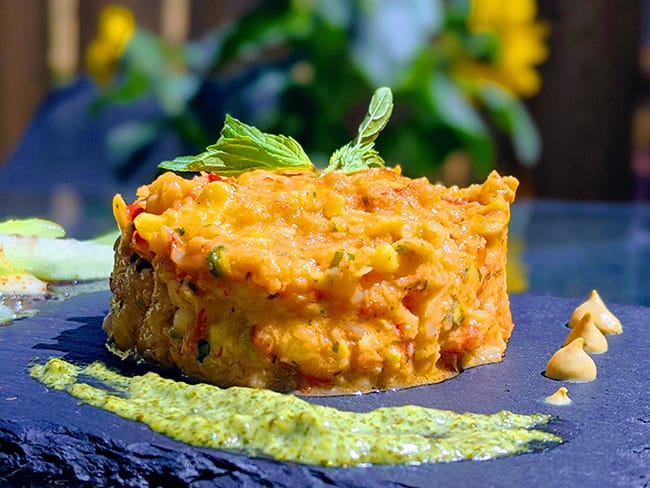 | Ingrédients | Homard, crevette, mayonnaise ( huile de canola et oeuf), avocat, coriande, piri piri, érable en flocon, huile de sésame, oignon vert, sriracha, câpre, jus de lime, sel. |