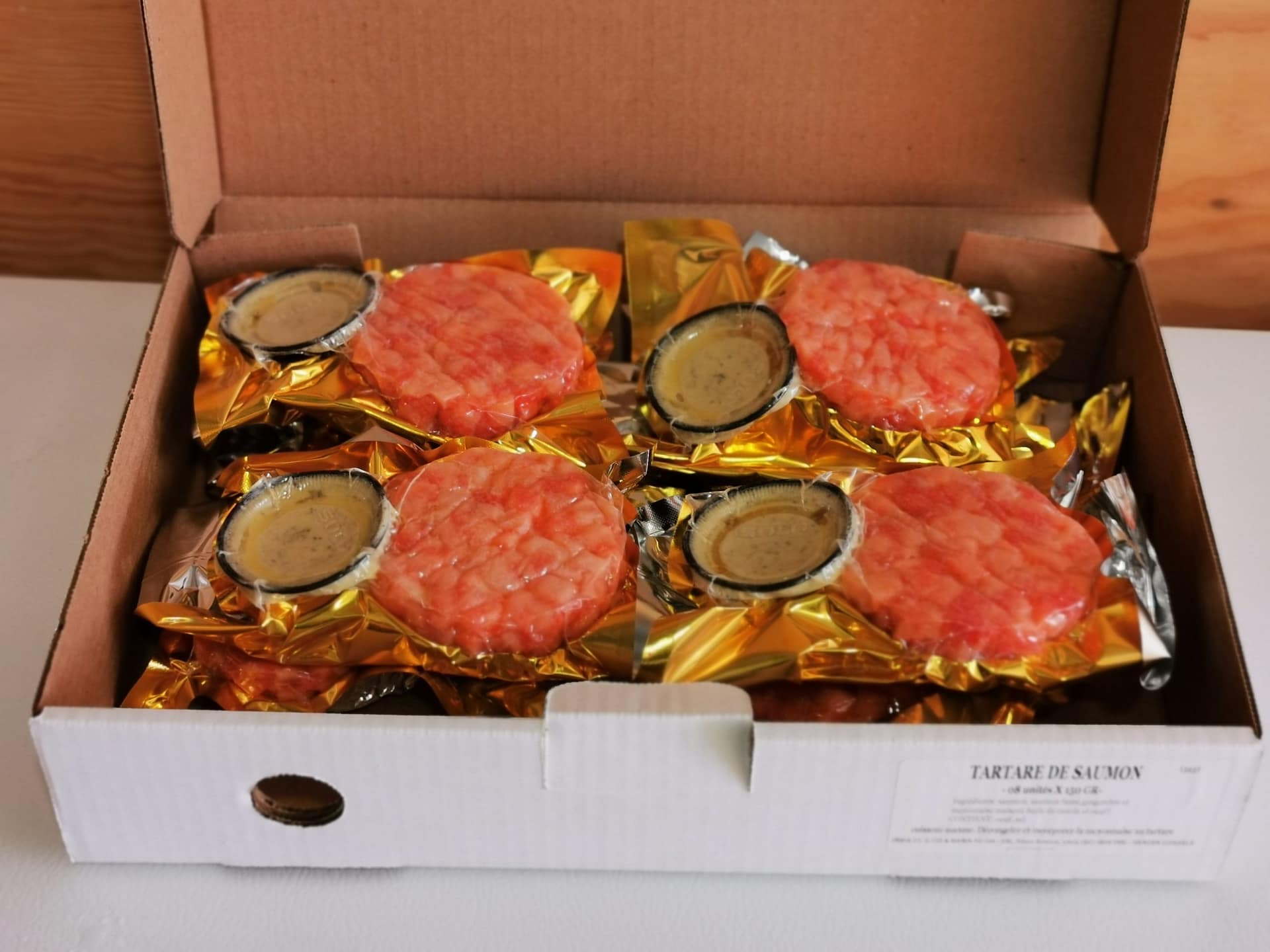 - (Saumon nature, Saumon fumé. coupé à la main avec une sauce mayonnaise, câpres et gingembre.)